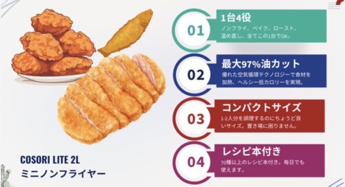 また、油を975もカットしてくれるのは、揚げ物好きさんにはたまらないですし、今まで揚げ物はちょっと重たくて…と遠ざけていた方にも、これで調理したものなら美味しく食べられるかもしれません。